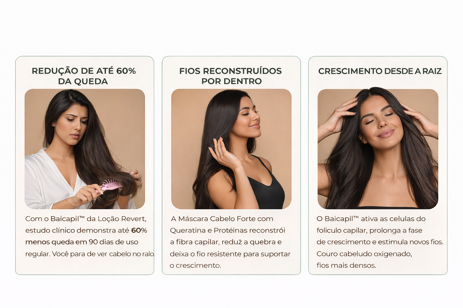 A Loção Revert com Baicapil™ age diretamente no folículo capilar — ativando o crescimento e auxiliando na redução da queda. Aplique e NÃO enxágue.